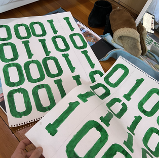 Once I finished painting the numbers for the binary code backdrop, tested out to see if I had made enough by making a makeup backdrop in the hallway. I measured my backdrop on the wall with painters tape and then spaced out the numbers accordingly. I ended up not having enough numbers for the effect that I wanted. My plan had envisioned lines of code hanging from the ceiling and on the backdrop some of them going all the way to the bottom.